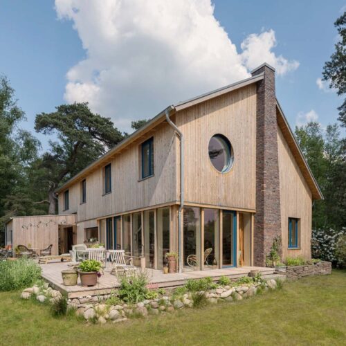 Einfamilienhaus mit Holzfassade mit einer unregelmäßigen Lattung