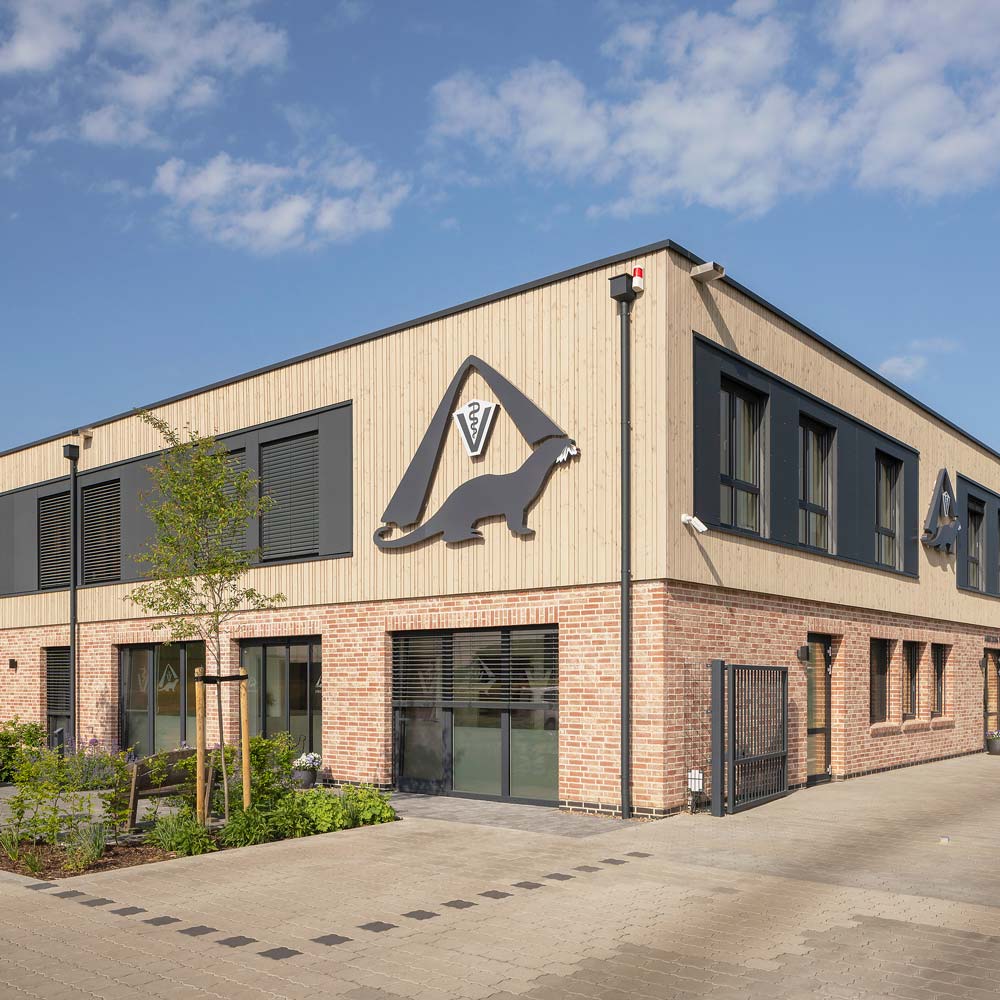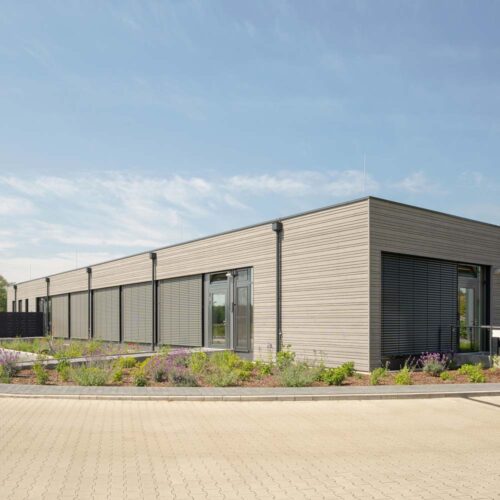 Gewerbehalle aus Holz mit Gewerbehof und Bürogebäude